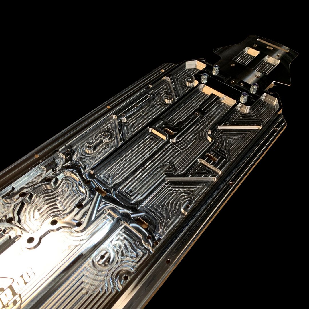 Our TAYLOR Chassis is machined from a 10mm thick billet of 6082 to achieve the minimum flex but pocketed out so that its similar weight as a stock chassis (only around 140g heavier!). With the Front and Rear Inserts section made from 7075.