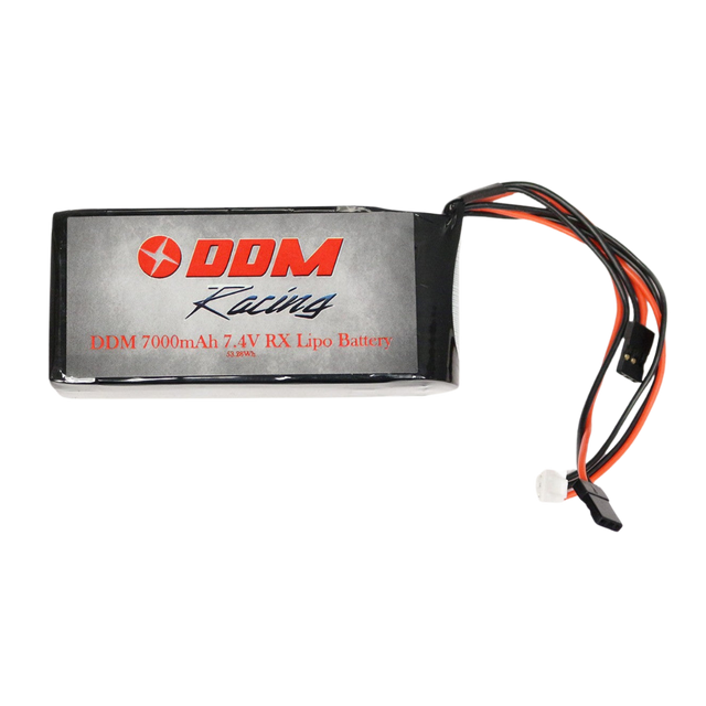 DDM Racing 7000 mAh LiPo receiver battery for the Kraken VEKTA, Losi 5IVE-T/Mini WRC, TLR 5IVE-B and RCMK XCR line of cars. Increase your run time over the original batteries with power to last. Features flexible 22 awg wire with a JR style servo connector and an XH type balance plug. There are two leads, one made to plug into your on/off switch and another for charging.