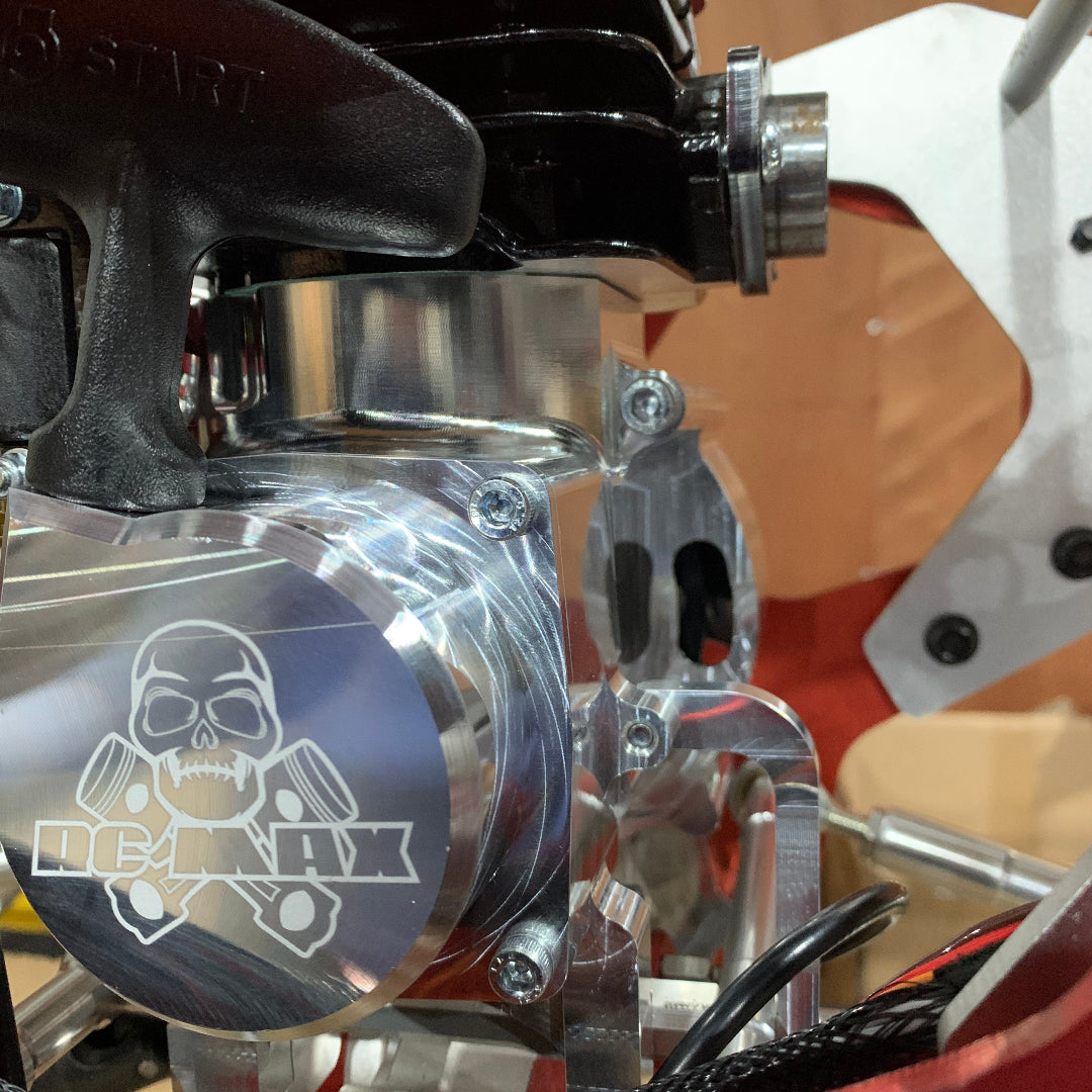While the stock engine is out, we highly recommend cutting out a section of the side chassis plate next to the pull starter so that you can fit the engine (or even the stock engine) Without having to remove the pull starter or remove the side chassis plate itself. (see photo above with section cut out around the pull starter).