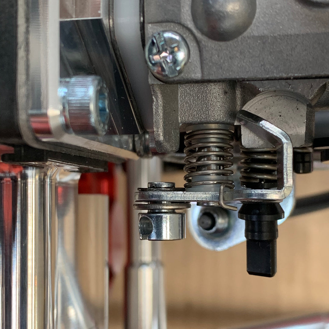 As mentioned above, if you cut your chassis it will drop in, if not, remove the pull start side chassis plate and then there is room to fit. Fit all the engine mounting bolts supplied. Next you can hook up the throttle linkage cable onto the big bore WJ71 carb. Simply remove the linkage cable hole from the stock carb by popping the bracket off and removing the E clip. Then put this piece onto the Hole cut out in the WJ71 Carb arm as shown in photos.