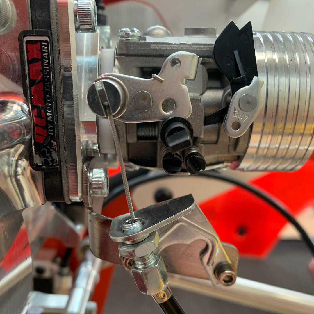 As mentioned above, if you cut your chassis it will drop in, if not, remove the pull start side chassis plate and then there is room to fit. Fit all the engine mounting bolts supplied. Next you can hook up the throttle linkage cable onto the big bore WJ carb. Simply remove the linkage cable hole from the stock carb by popping the bracket off and removing the E clip. Then put this piece onto the Hole cut out in the WJ Carb arm as shown in photos.