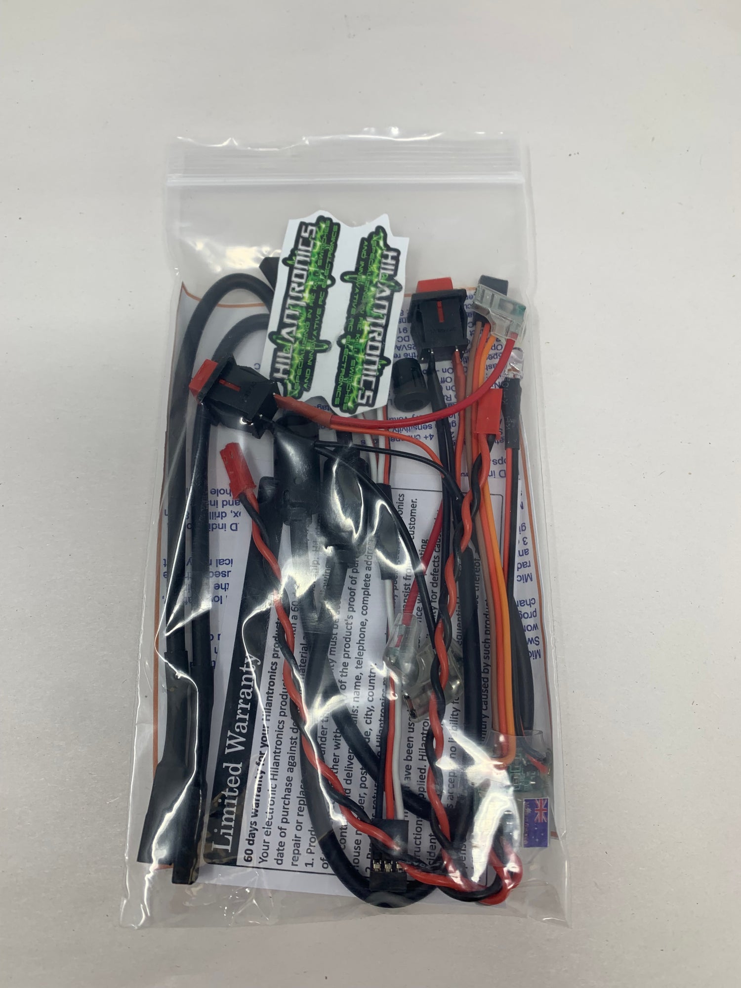 The kit comes with a prewired EMI filtered ignition cable with quick disconnect plug, 1 x Futaba Y lead and a remote super bright red LED indicator so the status signal can be seen externally. To mount the external LED on to your receiver box, drill an 8mm hole then slide the LED through from the inside of the box and insert the LED into the LED clip then push the clip with the LED in the hole until it stops.