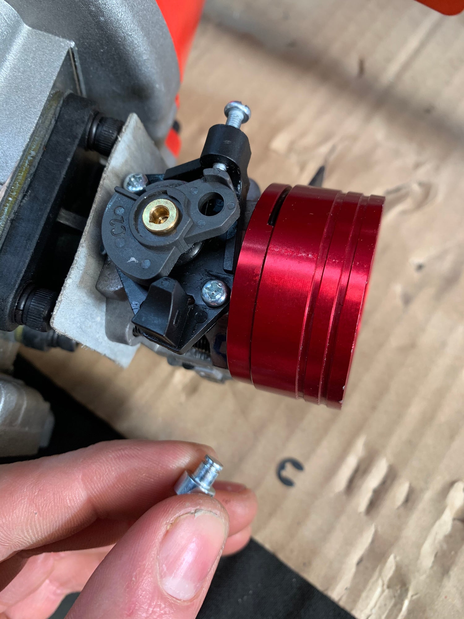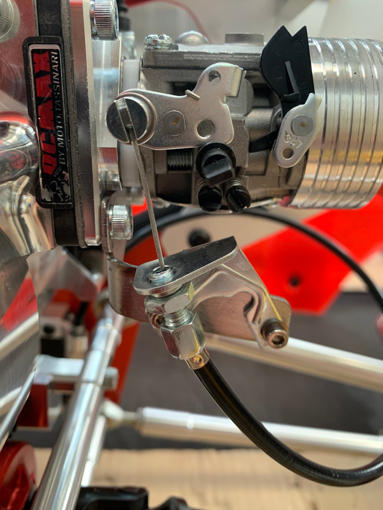 As mentioned above, if you cut your chassis it will drop in, if not, remove the pull start side chassis plate and then there is room to fit. Fit all the engine mounting bolts supplied. Next you can hook up the throttle linkage cable onto the big bore WJ71 carb. Simply remove the linkage cable hole from the stock carb by popping the bracket off and removing the E clip. Then put this piece onto the Hole cut out in the WJ71 Carb arm as shown in photos.